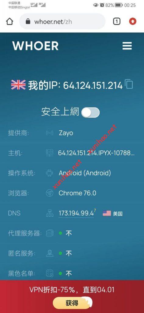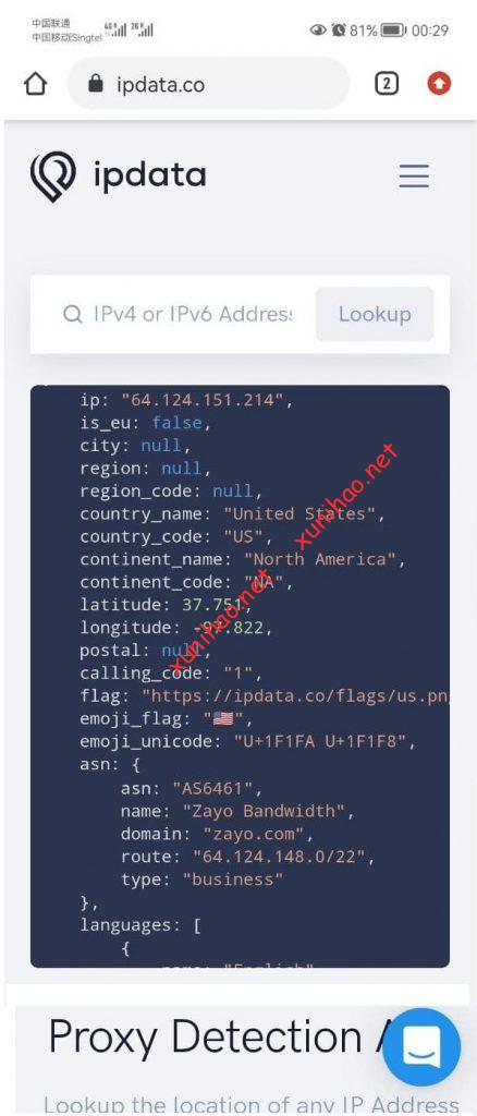 当我们使用zayo的流量卡打开网页查询,可以直接返回结果,这也间接说明了此美国流量卡的IP是原生美国IP。
