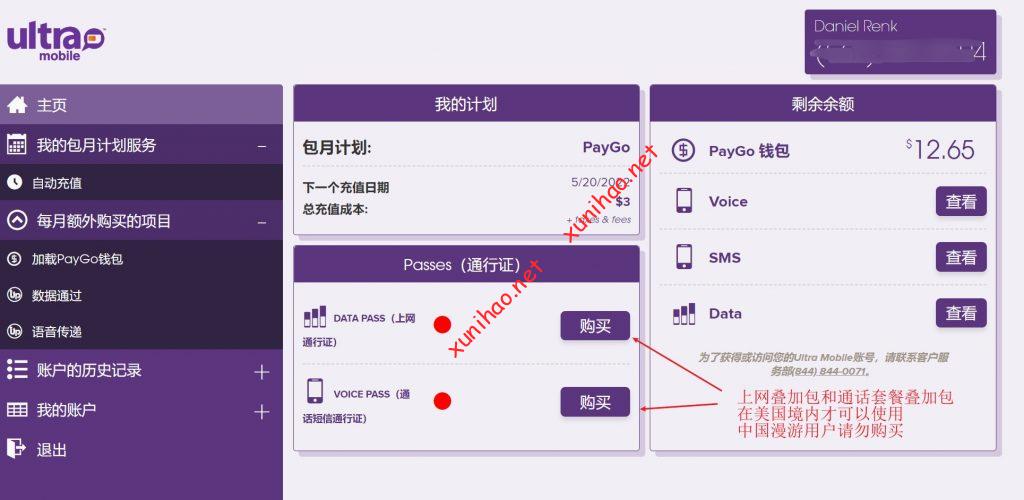 ultra mobile官网账户中的流量包和语音叠加包是在美国本土使用的,不能在国内使用