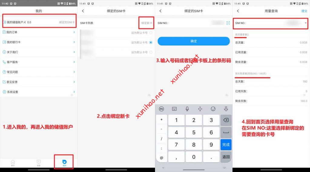 选择我的->绑定新的SIM卡->回到首页选择用量查询->选择需要查询的卡号->点提交