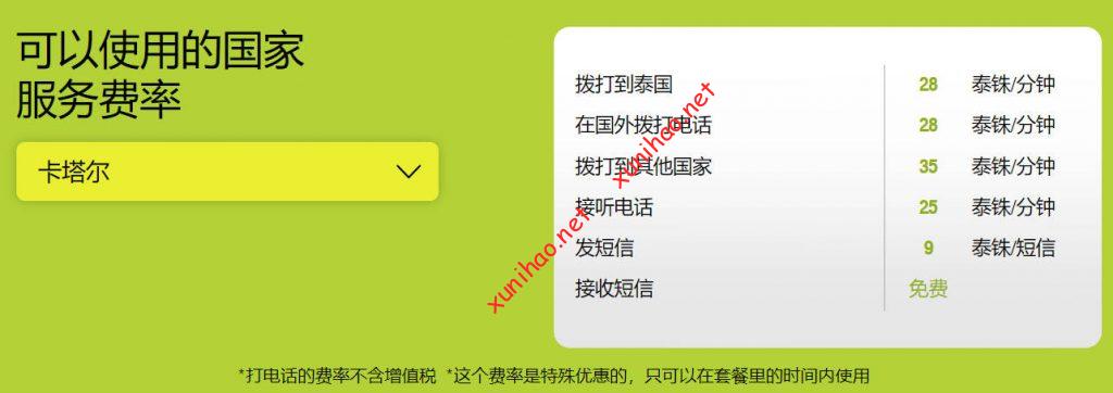 | 通话 | 套餐内可拨打中国号码 | 套餐内可拨打中国号码 | 需要充值才可拨打中国号码,卡塔尔拨打中国最低35泰铢1分钟 | 无通话 |