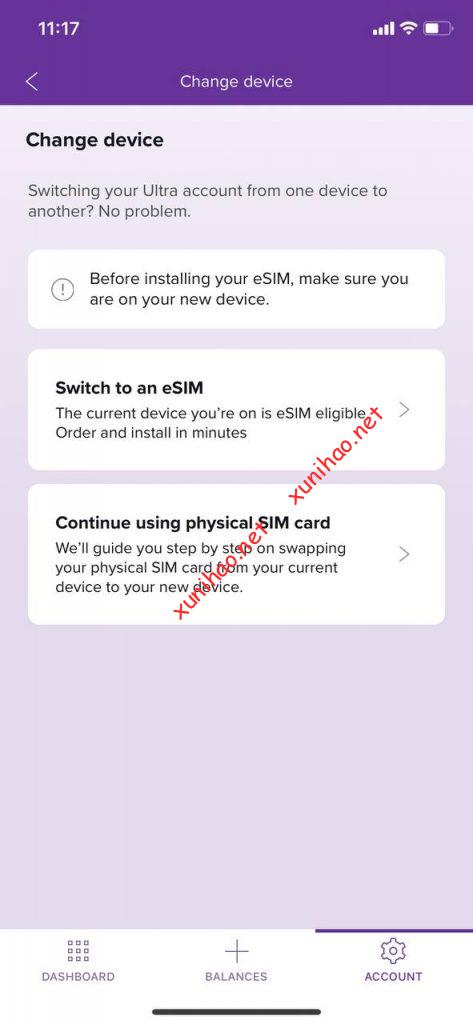右下角Account – Change Device – Switch to an eSIM – 确认设备 – 确认费用就可以进行转换了。(更换eSIM设备也是这个选项)