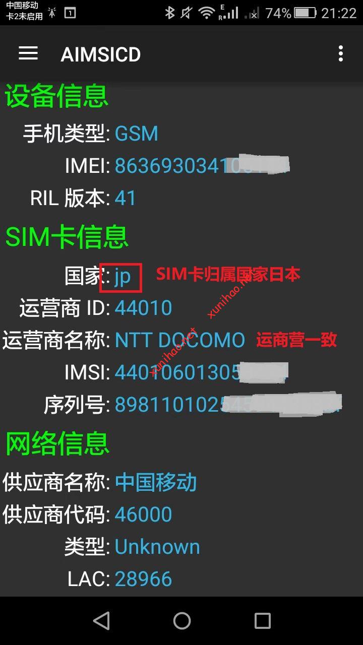 就像数码博主拿到新手机就会跑个分,虚拟号拿到了从未接触过的日本SIM卡,也会用检测SIM卡归属国家的AIMSICD软件来测一下,印证了这个卡是日本原生的实体电话卡。