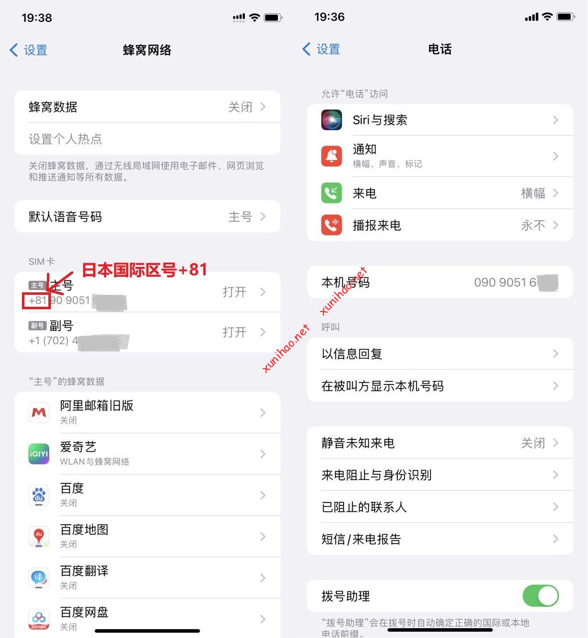 蜂窝网络里面显示为+81开头的日本号码,在设置-电话-本机号码也读到了号码。