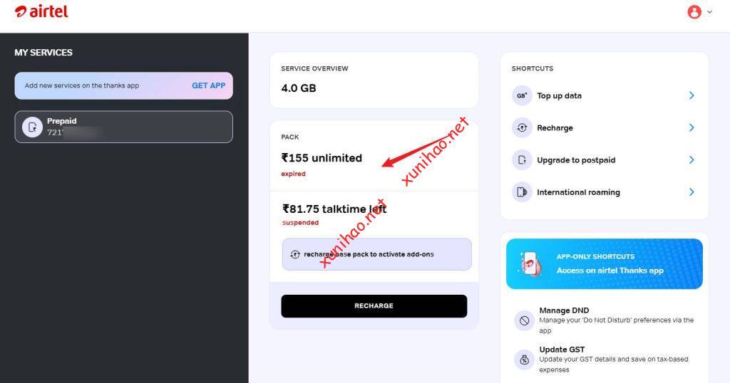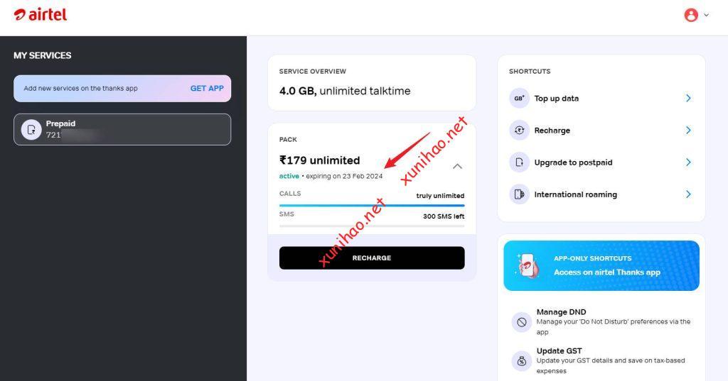 印度Airtel号码的各种信息,比如套餐、有效期和本机号码的查询,可以在官方APP(Airtel)或者官方网站里查