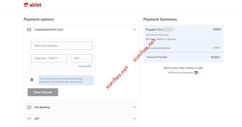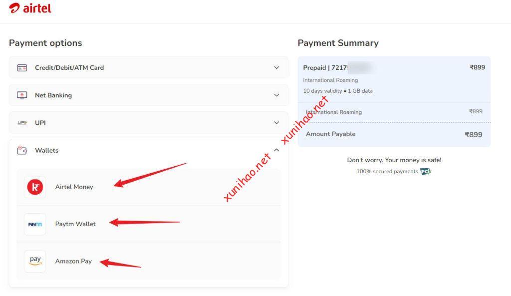 印度Airtel电话卡充值支付支持信用卡或其它电子钱包,需要准备好VISA或者万事达(Master)信用卡,或者能够在印度使用的电子钱包,比如Google pay和Amazon pay