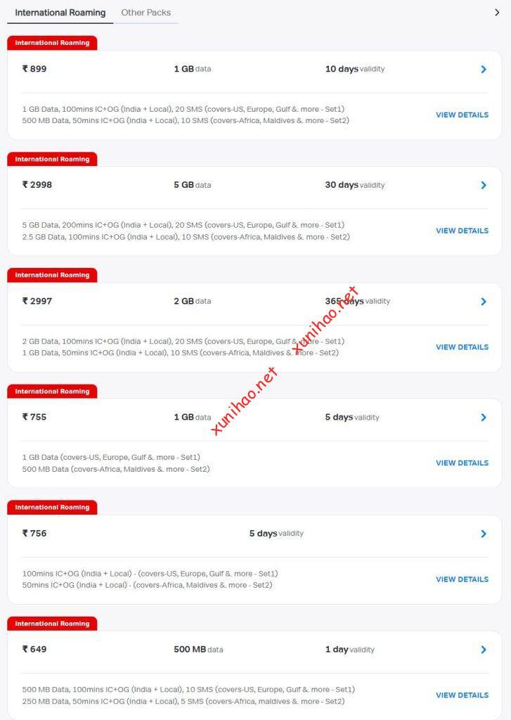 在选择购买套餐时,注意中国内地使用只能购买国际漫游套餐(International Roaming),其它套餐(Other Packs)只能在印度本地使用。
