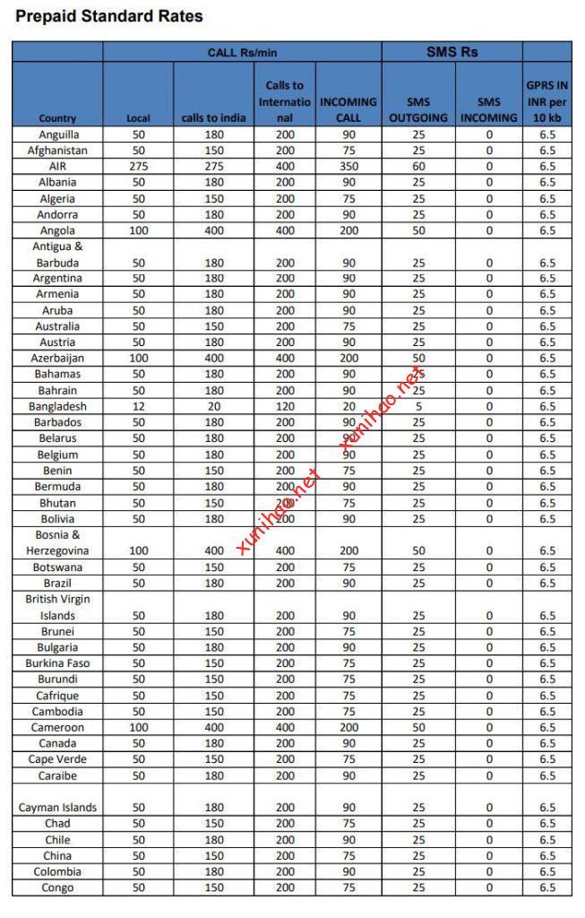 拨打其它国际通话45卢比/分钟。