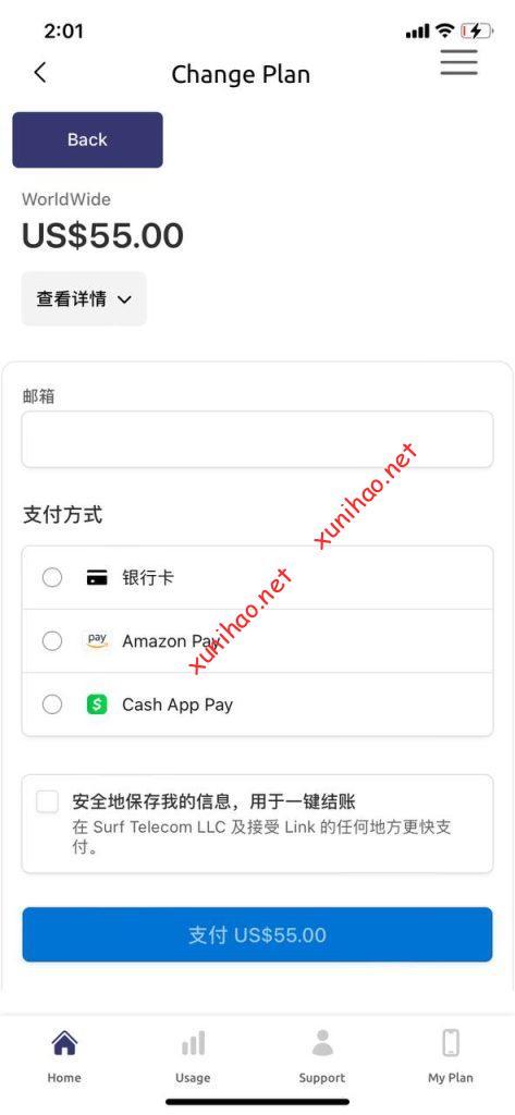 surf usa mobile是预付卡prepaid,用户收到卡就可以自己在官网登陆APP查询自己的用量,用自己的VISA或MASTER信用卡支付月租,只需要在月租扣费来临之前预缴下个月月租就可以一直使用。